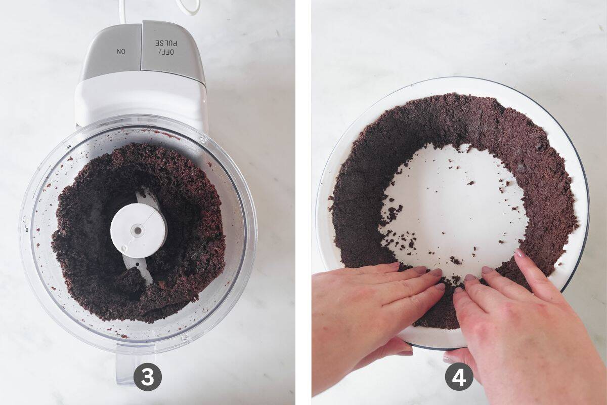 Step 1 & 2: Place the Oreo cookies in a food processor. Blend until they resemble fine crumbs.
