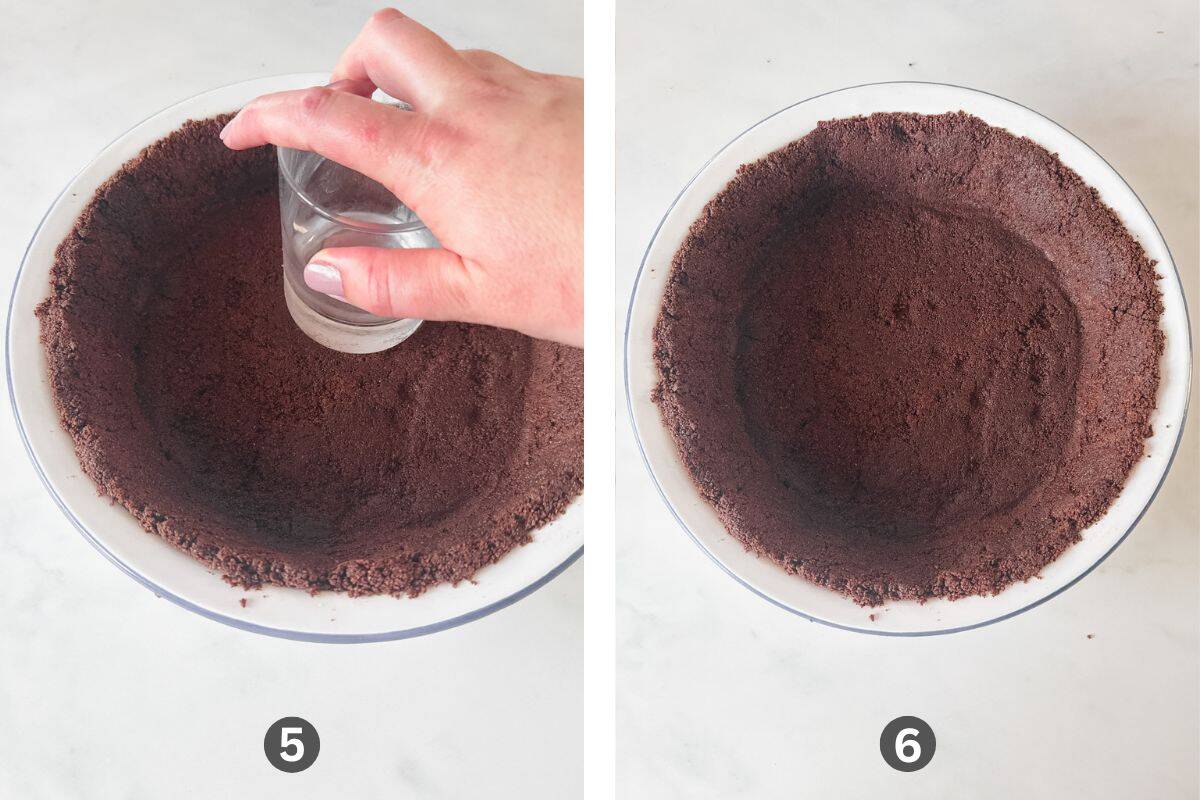 Step 5: Add the remaining Oreo crumbs into the pie dish and pack firmly on the bottom of the dish. I used a glass to help pack it firmly.